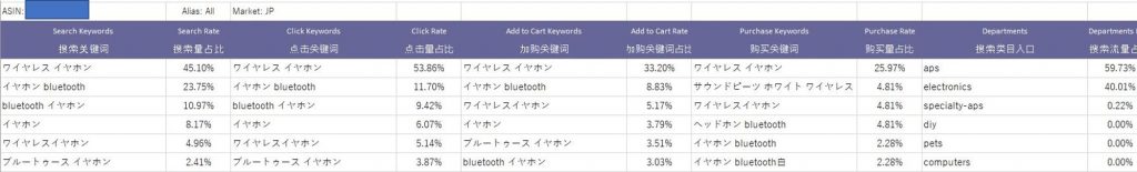 以前は、ASINレポート機能があり、対象のライバル商品のASINをセラースプライト側に30ドル~50ドル/1商品支払いすれば、下記のようなレポートを入手することができました。(今は使えません)